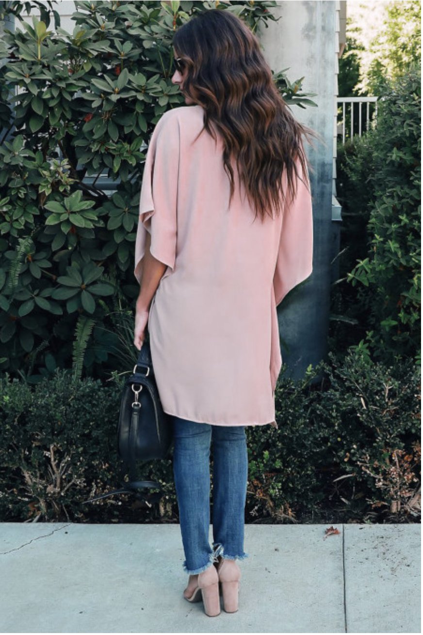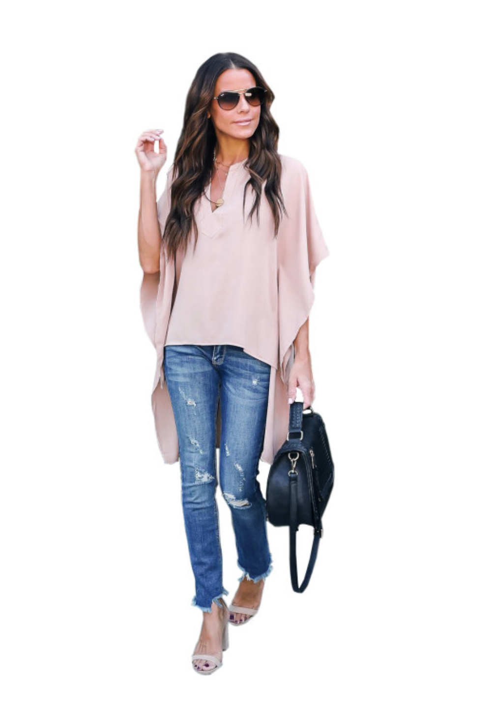 Elegant v neck, dramatic kimono sleeve with high low asymmetrical irregular hemline.