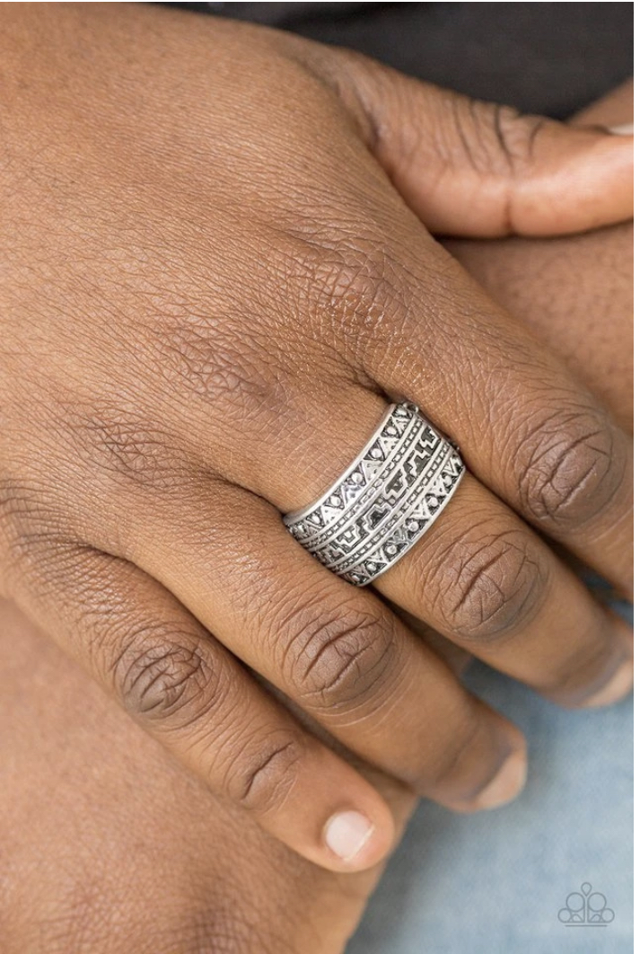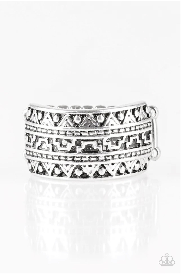 Brushed in an antiqued shimmer, a glistening silver band is embossed in stunning textile patterns for a seasonal look. Features a stretchy band for a flexible fit.