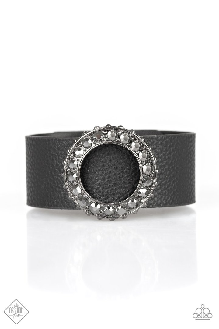 Encrusted in glittery hematite rhinestones, a studded gunmetal centerpiece slides along a thick black leather band, creating a deceptively simple statement piece. Features an adjustable snap closure.