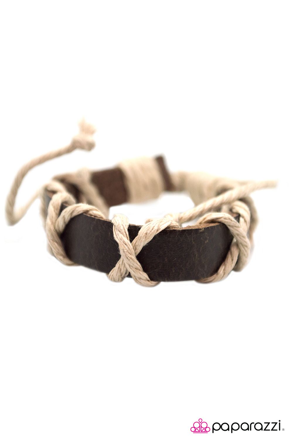 Tan twine winds around a simple brown leather band creating an 'X' pattern. The rough rope texture mixed with the smooth leather surface creates an urban and earthy combo. Features a sliding knot closure for an adjustable fit.