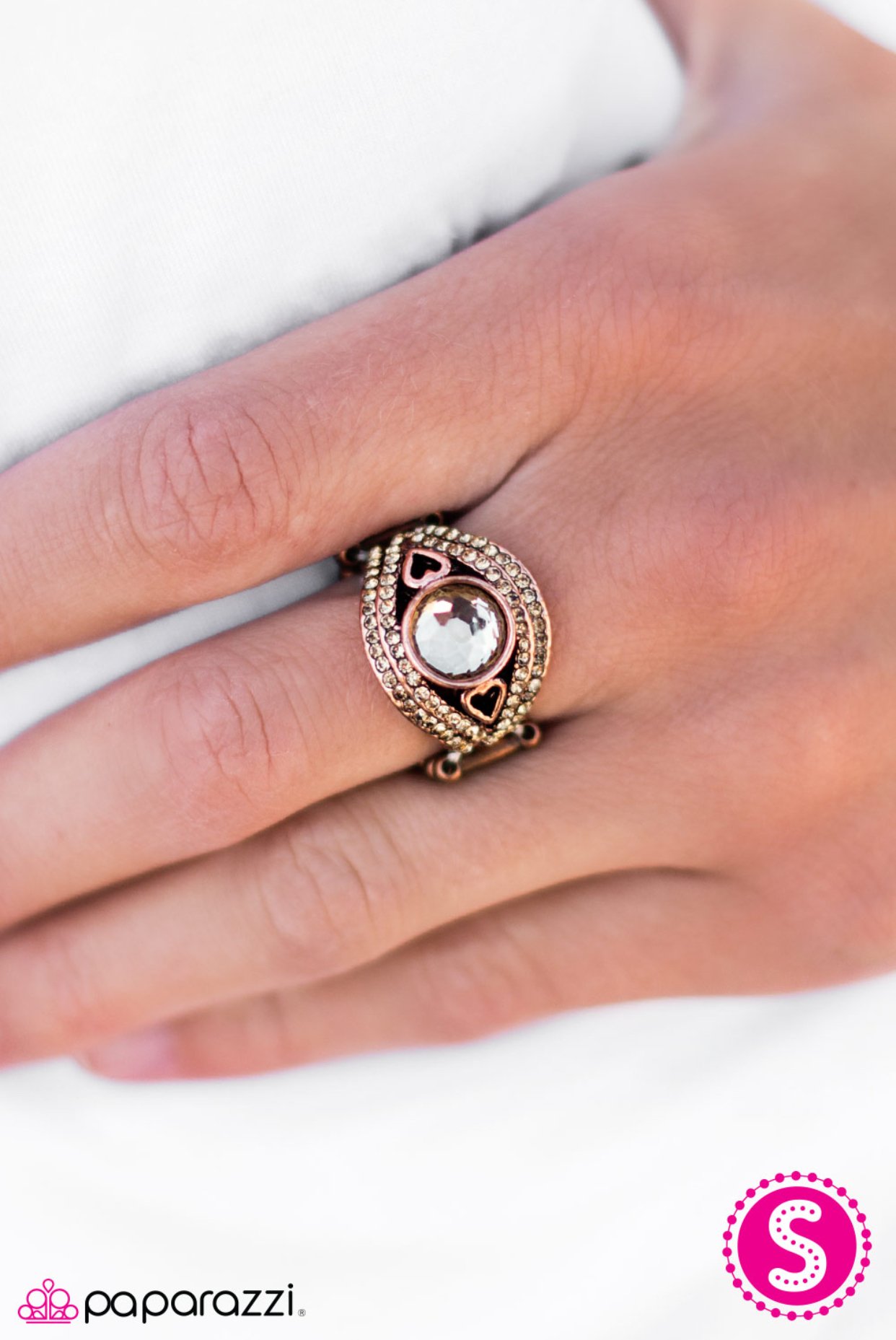 Two dainty heart silhouettes delicately frame the sides of a golden gem center. Glittery topaz rhinestones encrust two sweeping copper bands for a beautiful finish.