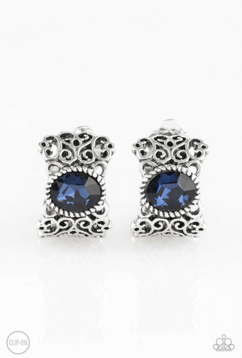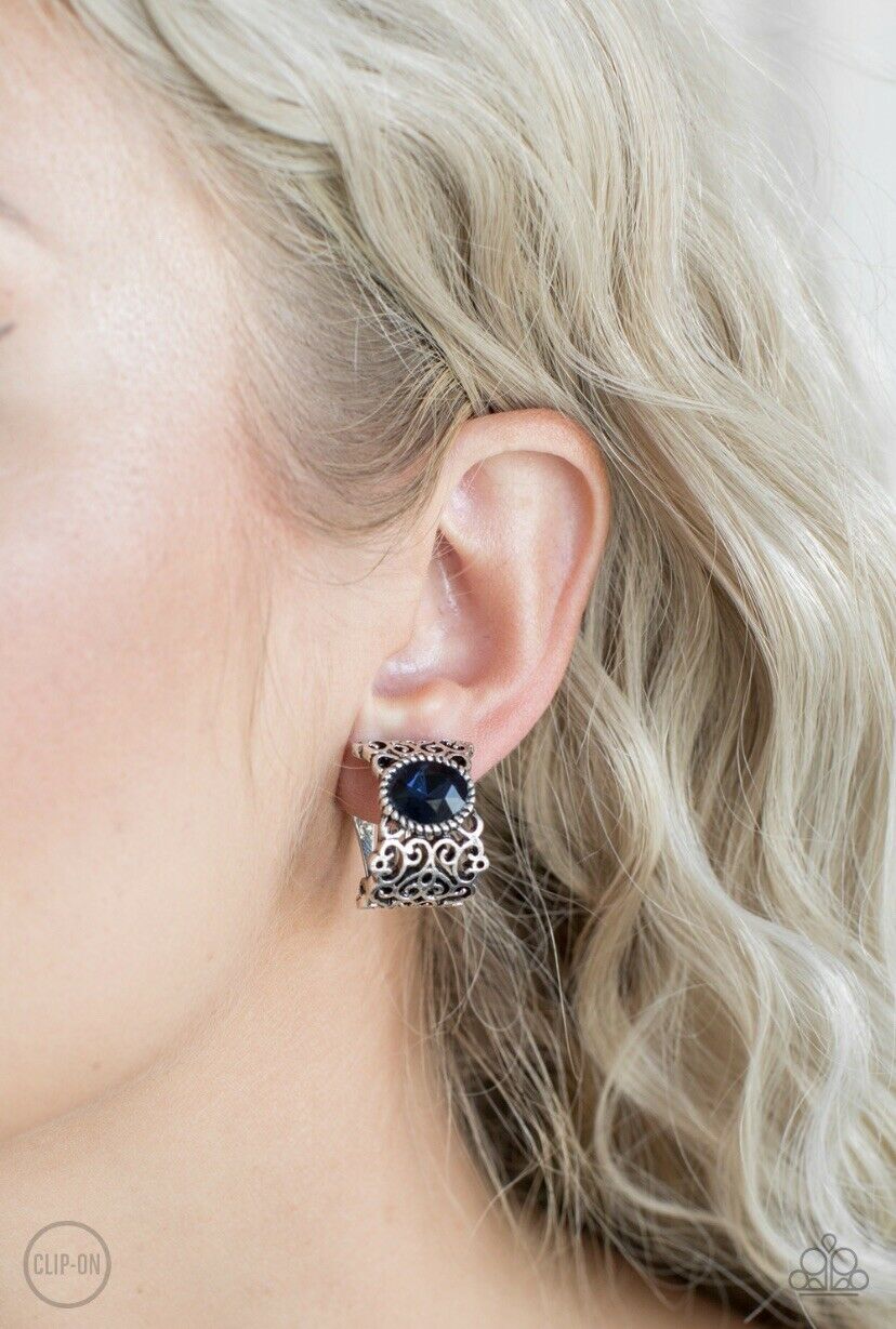 Brushed in an antiqued shimmer, vine-like filigree climbs into a glistening silver hoop. A glittery blue rhinestone is pressed into the top of the frame for a regal finish. Earring attaches to a standard clip-on fitting.