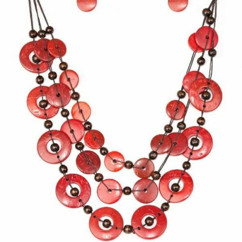 Brushed in a shell-like iridescence, fiery red wooden discs and round brown wooden beads are knotted along three strands of brown cording for a summery look. Features a button loop closure.