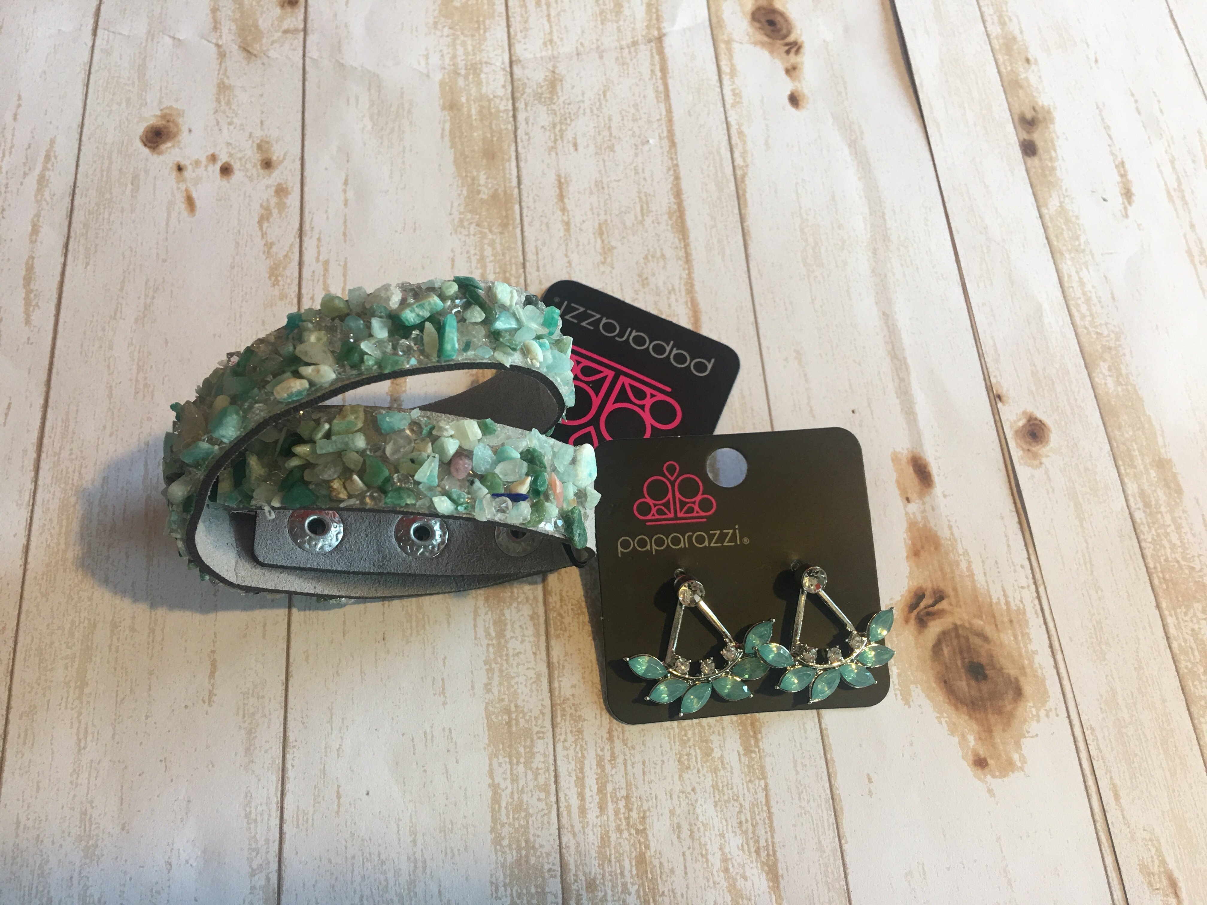 Crush to Conclusions- A collection of crushed green rocks and glassy white rhinestone prisms are sprinkled across a gray suede band for a seasonal look. The elongated band allows for a trendy double wrap design. Features an adjustable snap closure.