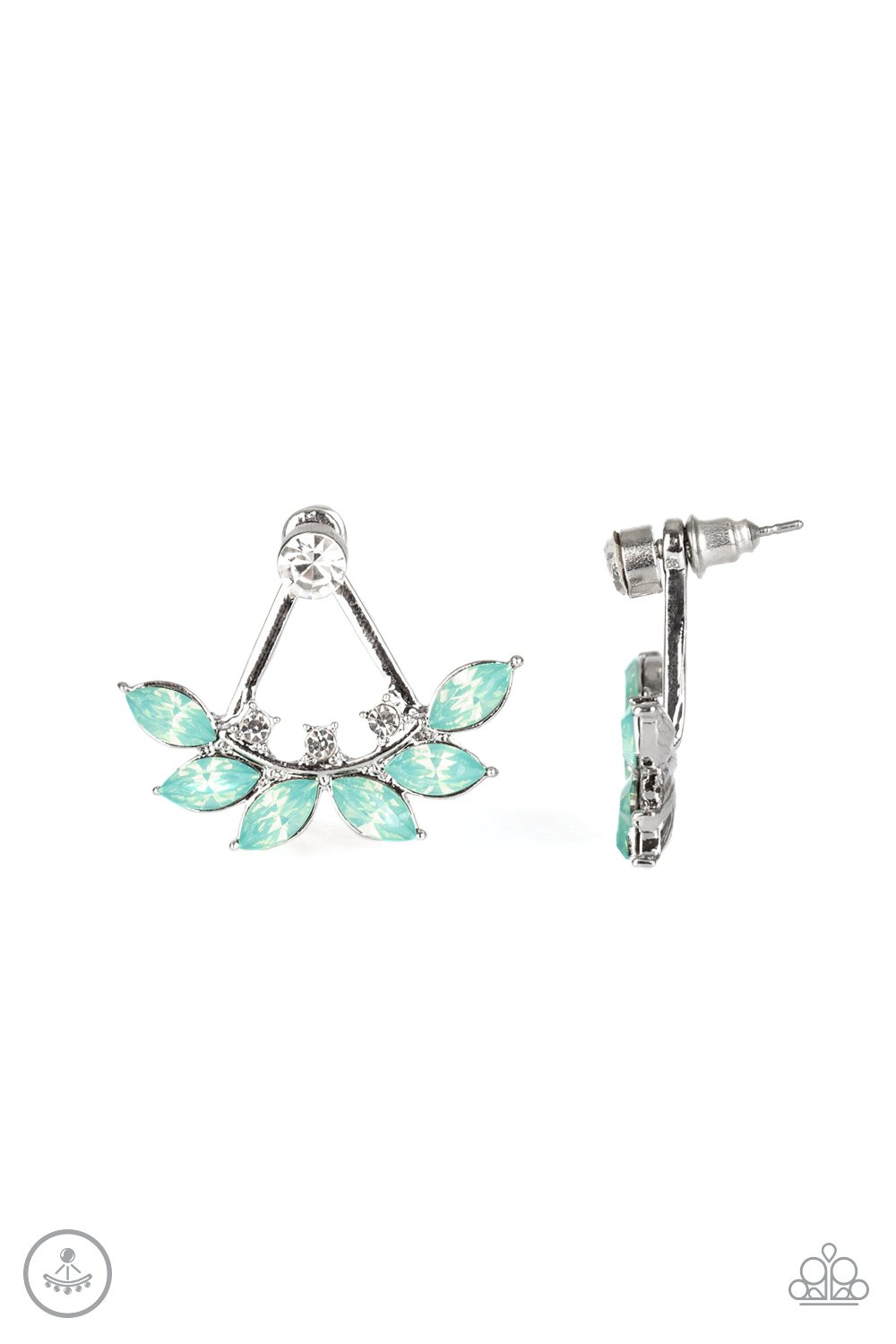 Forest Formal - A solitaire white rhinestone attaches to a double-sided post, designed to fasten behind the ear. Encrusted in dainty white rhinestones and leafy green rhinestones, the angular double-sided post peeks out beneath the ear, creating a glittery foliage. Earring attaches to a standard post fitting.