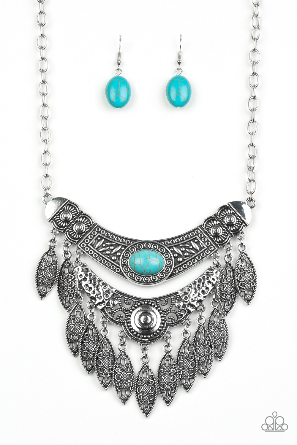 Featuring a collision of hammered, studded, and embossed patterns, two silver half-moon plates dramatically stack below the collar. Swirling with studded filigree detail, ornate silver frames swing from the bottoms of the stacked pendants, creating a fierce tribal inspired fringe. A refreshing turquoise stone is pressed into the center of the uppermost frame for a seasonal finish. Features an adjustable clasp closure.
