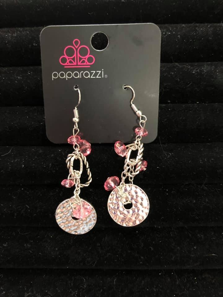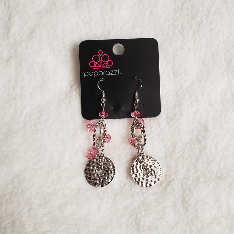 Rippling with glistening textures, a glistening silver disc hangs from silver chains accented with an array of glassy pink accents for a seasonal look. Earring attaches to a standard fish hook fitting.