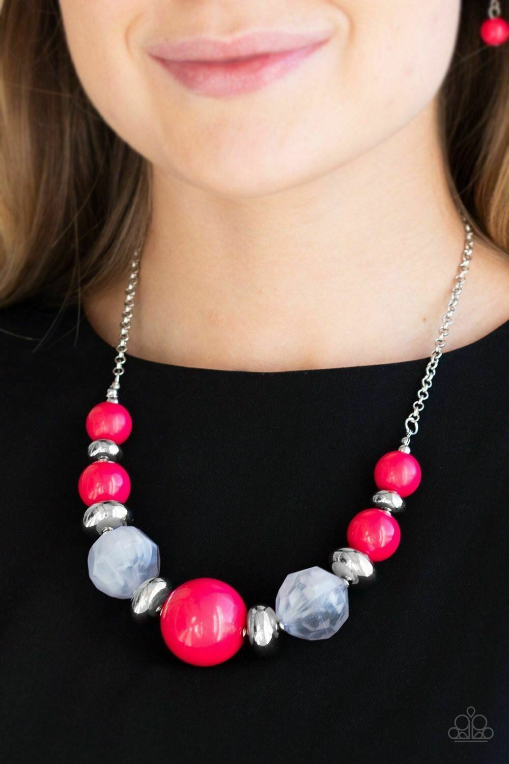 Gradually increasing in size near the center, a collection of red, silver, and cloudy beads join below the collar in a statement making fashion. Features an adjustable clasp closure.