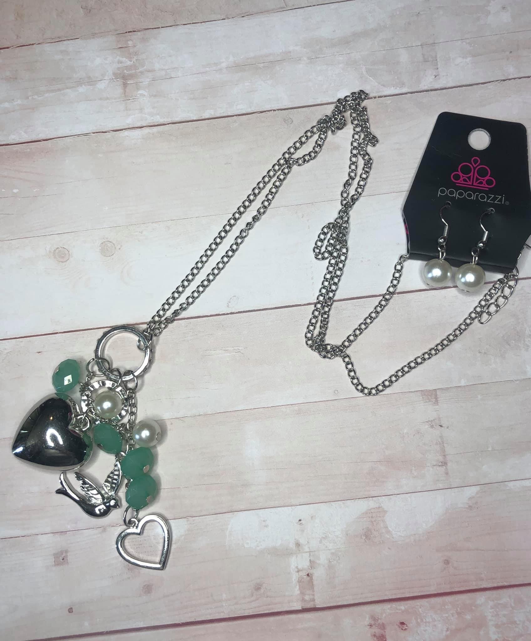 A silver bird charm, silver heart charms, and collection of white pearls and opaque green crystal-like beads swing from the bottom of a lengthened silver chain for a whimsically clustered look. Features an adjustable clasp closure.