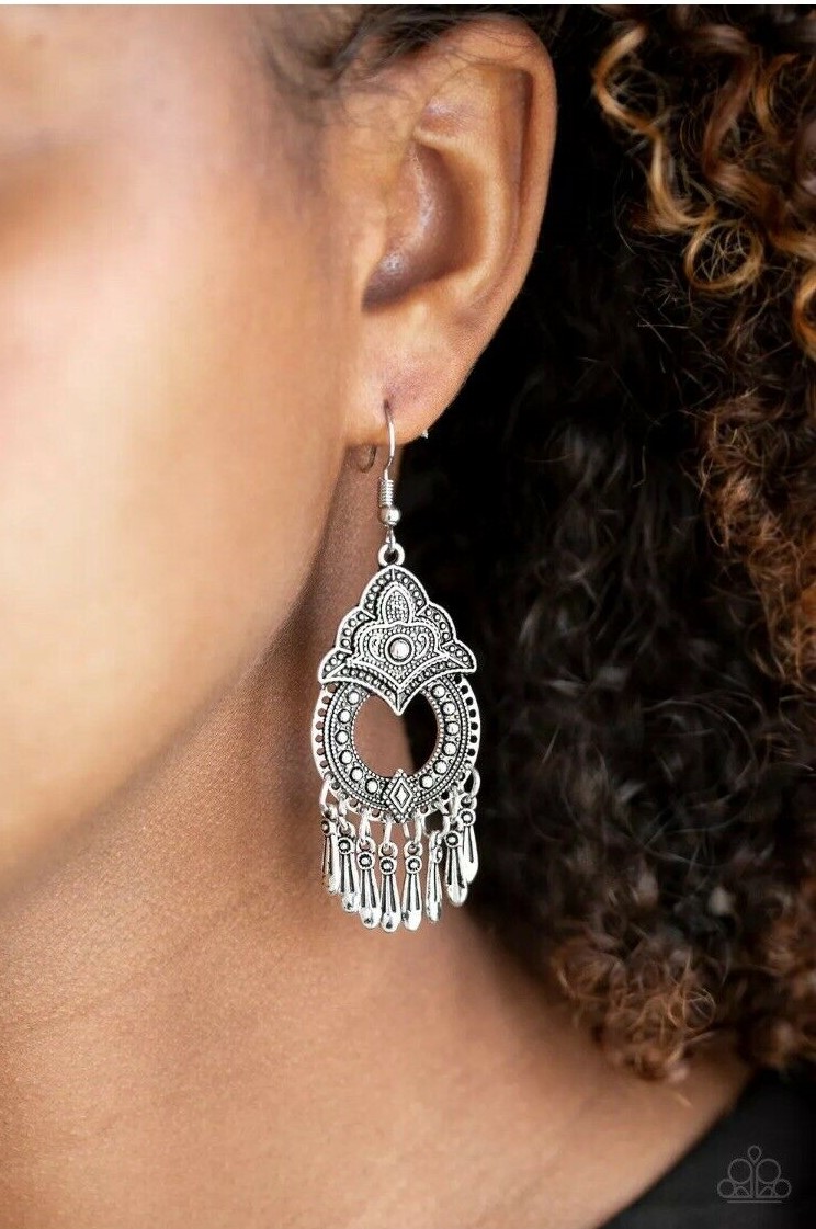 Studded in shimmery detail, an ornate silver frame swings from the ear in a whimsical fashion. Dainty silver beads swing from the bottom of the frame for a flirty tribal inspired fashion. Earring attaches to a standard fishhook fitting.