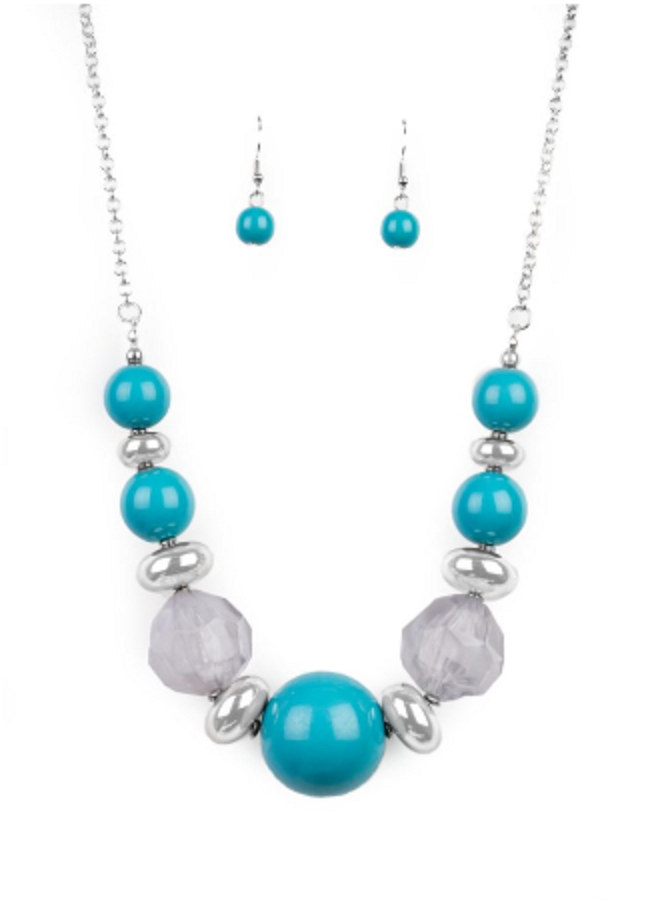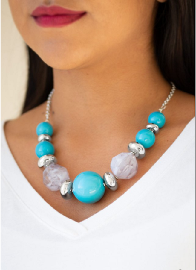 Gradually increasing in size near the center, a collection of blue, silver, and cloudy beads join below the collar in a statement making fashion. Features an adjustable clasp closure.