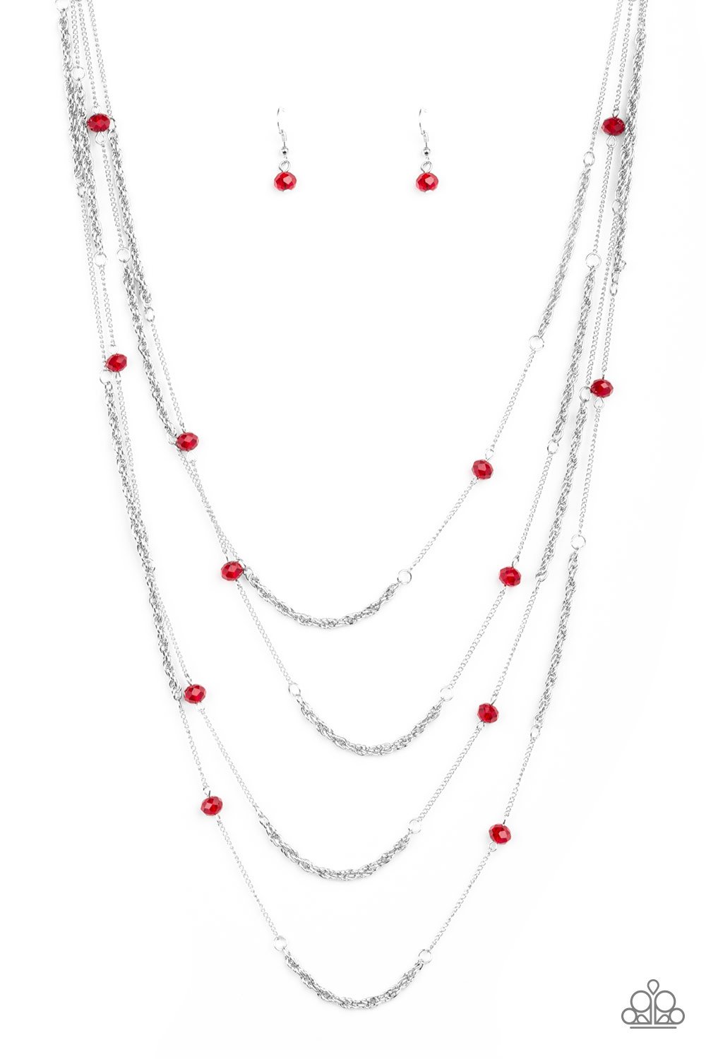 Red crystal-like beads trickle along three mismatched silver chains, creating shimmery layers across the chest. Features an adjustable clasp closure.