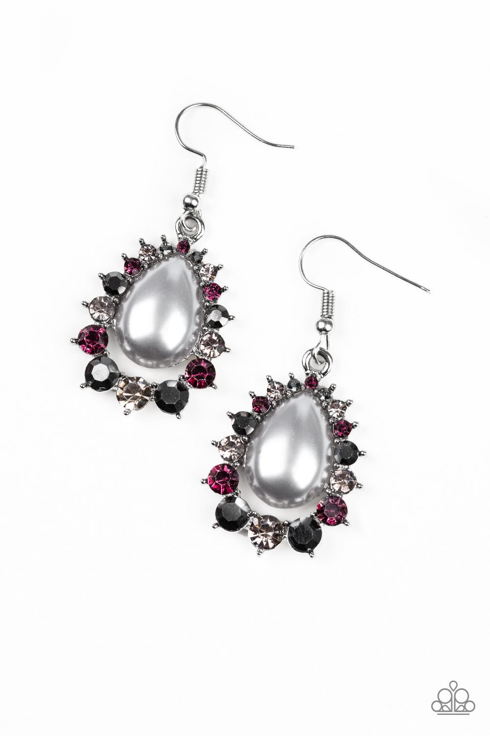 Gradually increasing in size, smoky, purple, and hematite rhinestones spin around a pearly silver teardrop center, creating a regal lure. Earring attaches to a standard fishhook fitting.