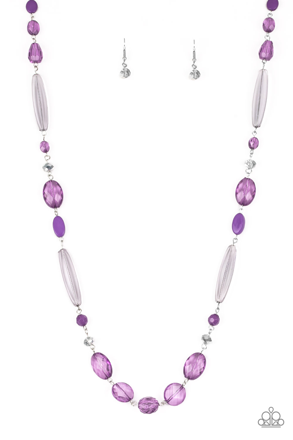 Varying in shape and shimmer, faceted purple and metallic crystal-like beads trickle down the chest for a whimsical look. Features an adjustable clasp closure.