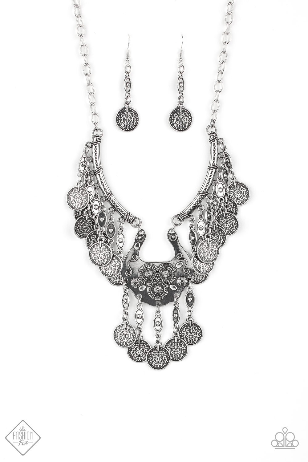 Silver coin-like discs dangle from the bottom of three ornate silver plates, resulting in a noise-making fringe below the collar. The unique shape of the silver plates creates an onion-shaped silhouette, reminiscent of Indian influence. Features an adjustable clasp closure.