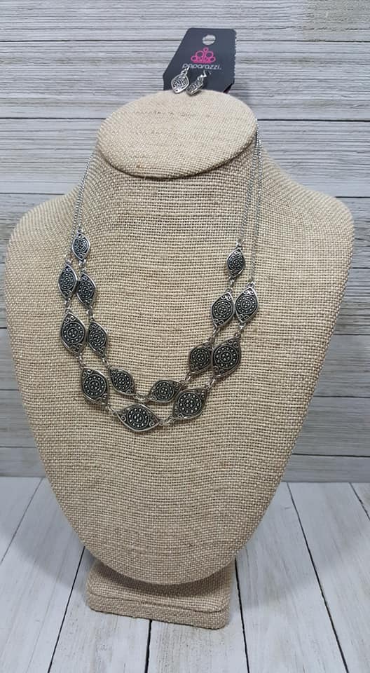 Rows of delicately designed eye-shaped patterns link together for a tribal-inspired look that falls below the collar. Features an adjustable clasp closure.