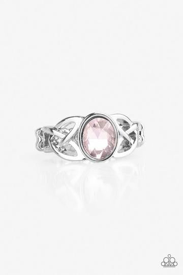 A glittery pink gem is pressed into the center of a shimmery silver band rippling in a filigree pattern for a refined look. Features a dainty stretchy band for a flexible fit.