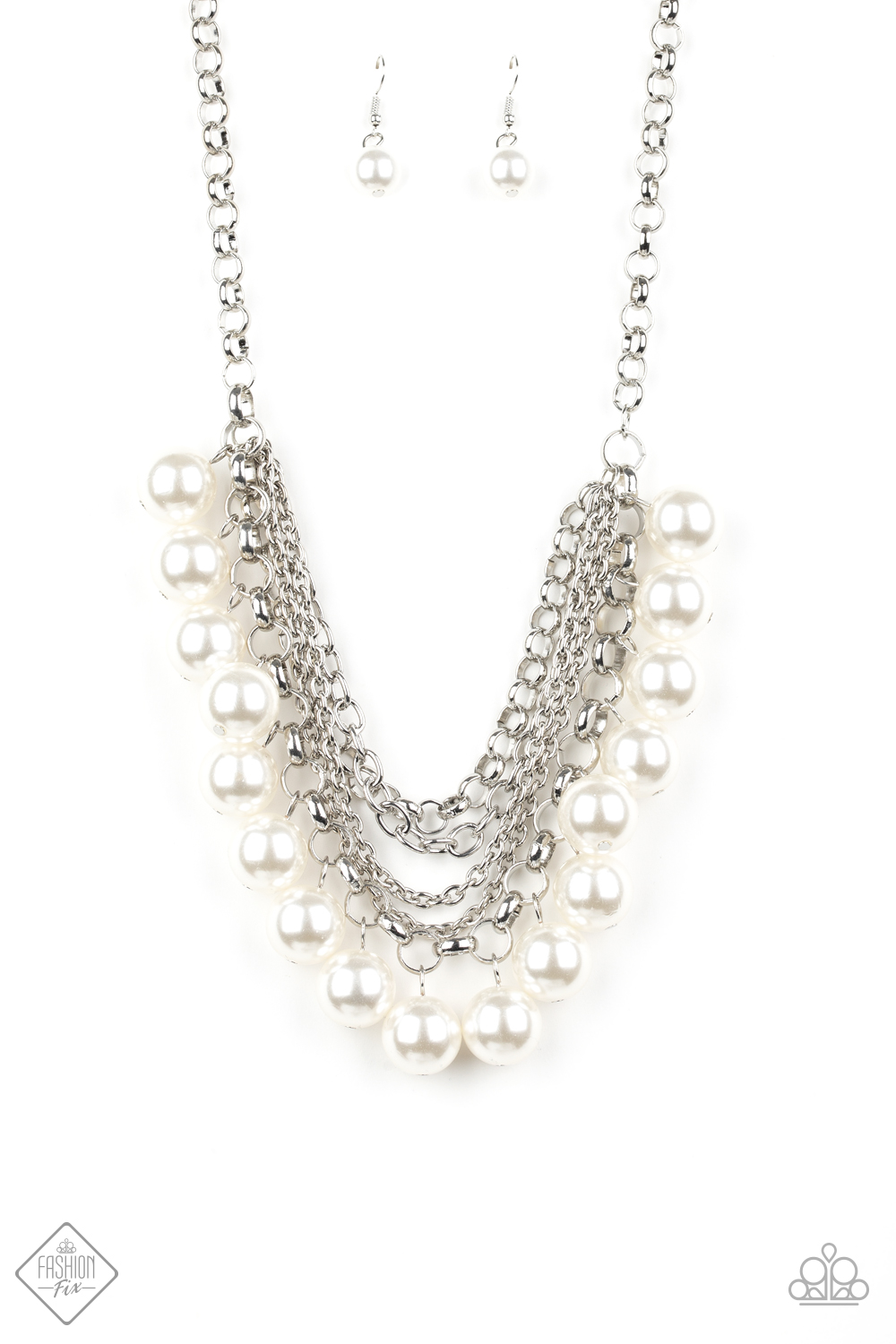 A collision of mismatched silver chains layer below the collar. Oversized white pearls dangle from the lowermost chain, creating a dramatically refined fringe for a statement-making finish. Features an adjustable clasp closure.