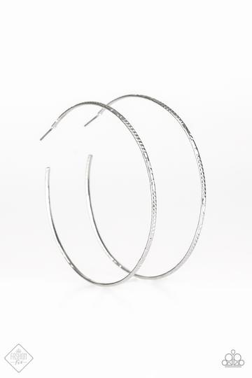 Chiseled and hammered in mismatched textures, a skinny silver hoop curls around the ear in an exaggerated display. Earring attaches to a standard post fitting. Hoop measures 2 3/4" in diameter.