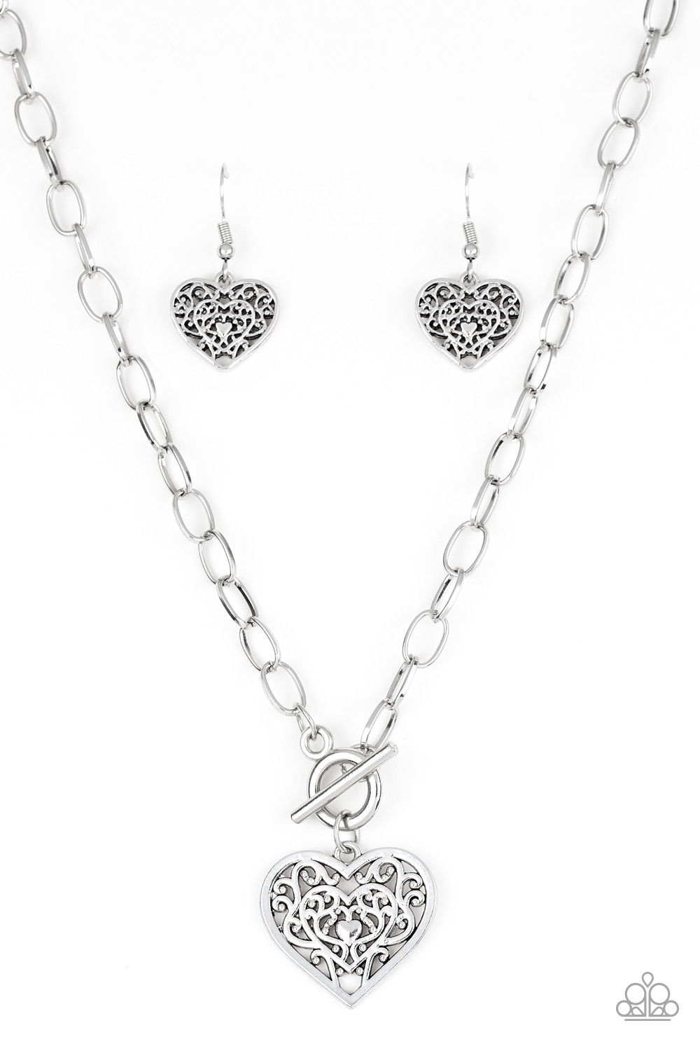 Brushed in an antiqued finish, silver filigree climbs a heart-shaped frame, creating a vintage inspired pendant below the collar. Features a toggle closure.