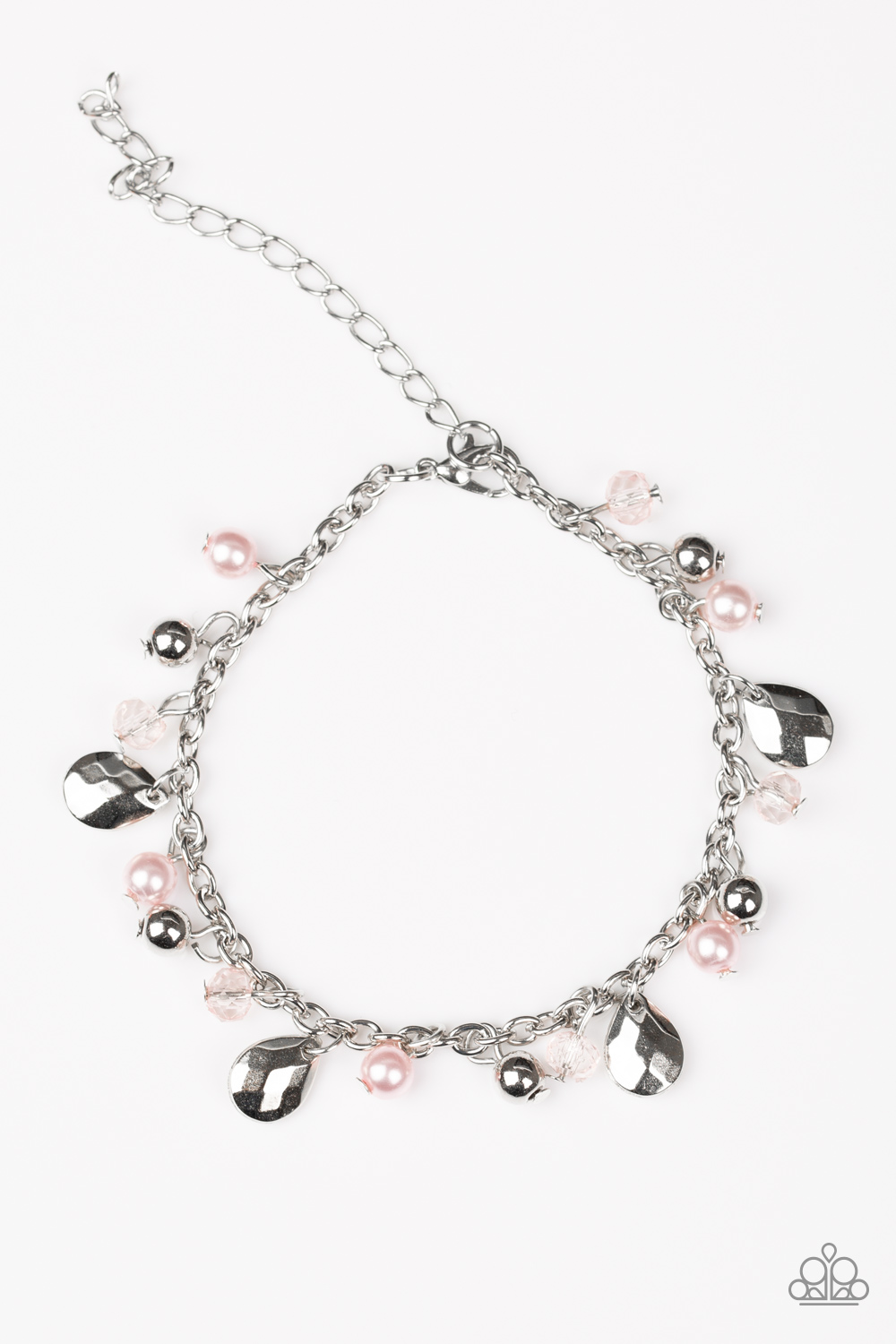 Pearly pink and crystal-like beads trickle from a silver chain, creating a bubbly fringe around the wrist. Faceted silver teardrops drip between the colorful beading, adding timeless shimmer to the seasonal look. Features an adjustable clasp closure.