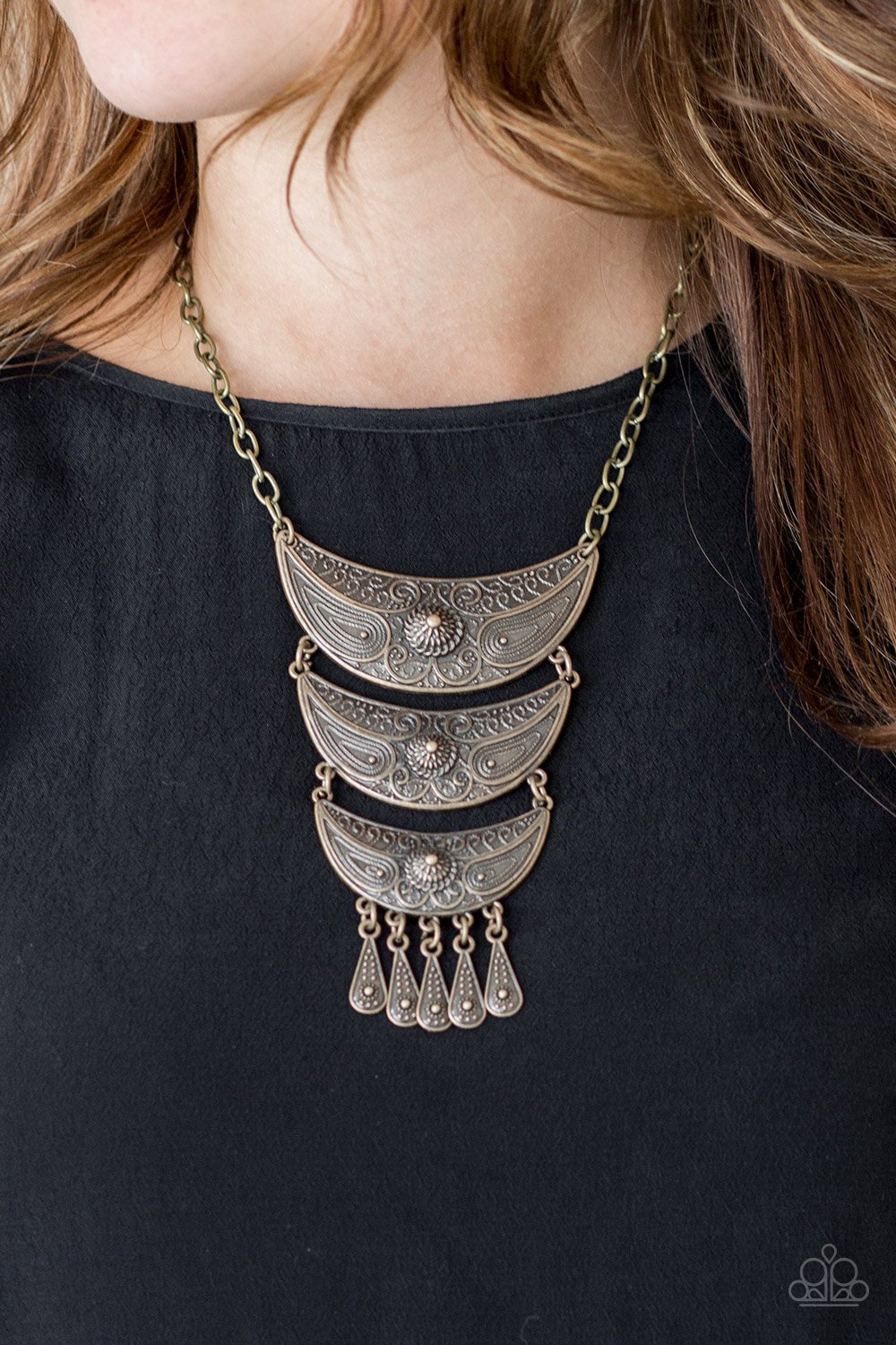 Gradually decreasing in size down the chest, decorative brass crescent plates connect into a bold pendant. Dotted in dainty studs, teardrop brass frames swing from the bottom of the tribal inspired pendant for a fierce finish. Features an adjustable clasp closure. Sold as one individual necklace. Includes one pair of matching earrings.