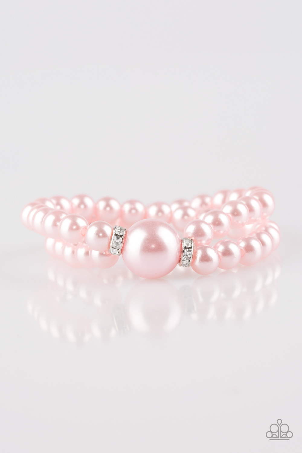 Joined at the center by an oversized pink pearl and a pair of white rhinestone encrusted rings, classic pink pearls are threaded along stretchy bands around the wrist for a timelessly layered look.