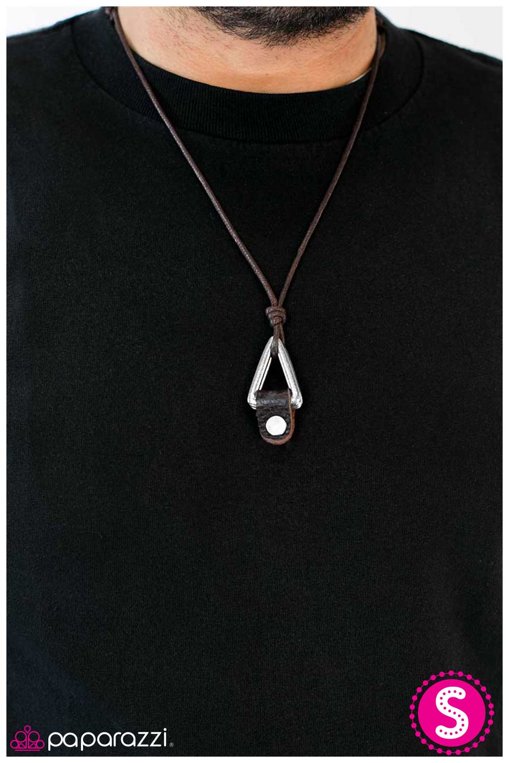 Two silver triangles are connected by a folded leather strip with a masculine silver bolt. Features an adjustable sliding knot closure.