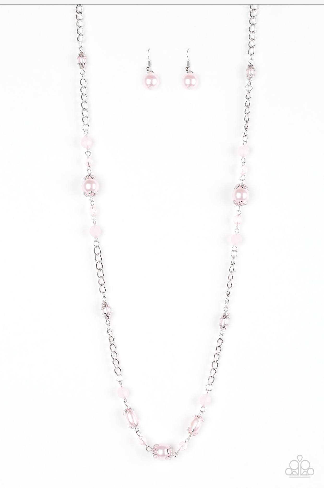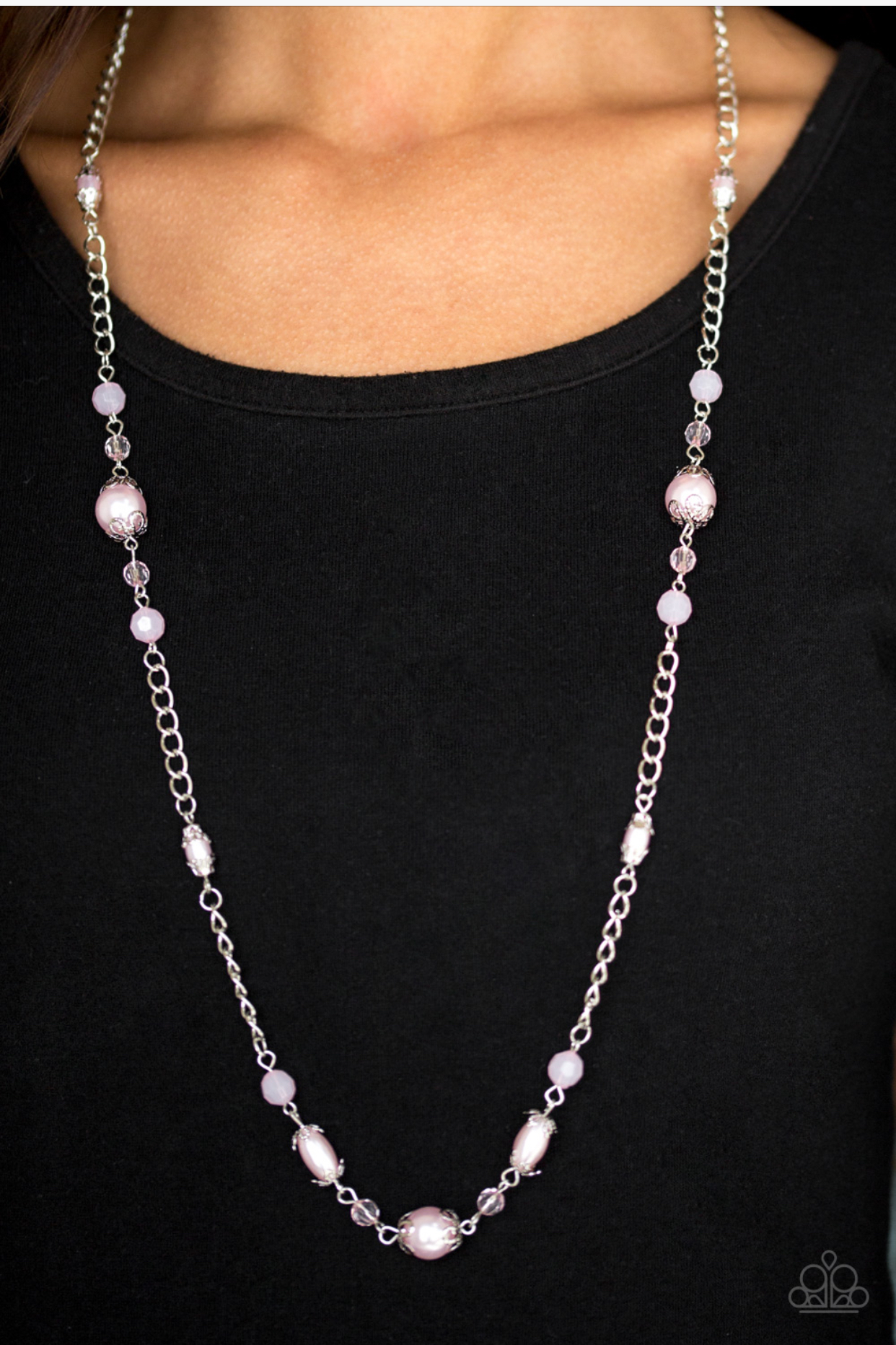Pearly pink, faceted and opaque crystal-like beads trickle along an elegantly elongated silver chain for a refined look. Features an adjustable clasp closure.
