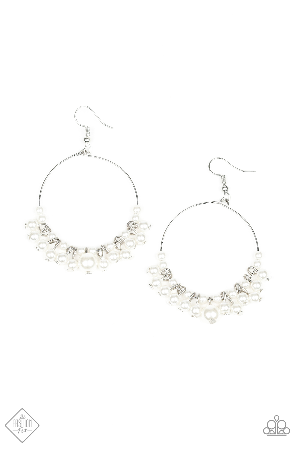 A fringe of white pearls dances along the bottom of a skinny silver wire hoop, creating a carefree take on a timeless classic. Earring attaches to a standard fishhook fitting.