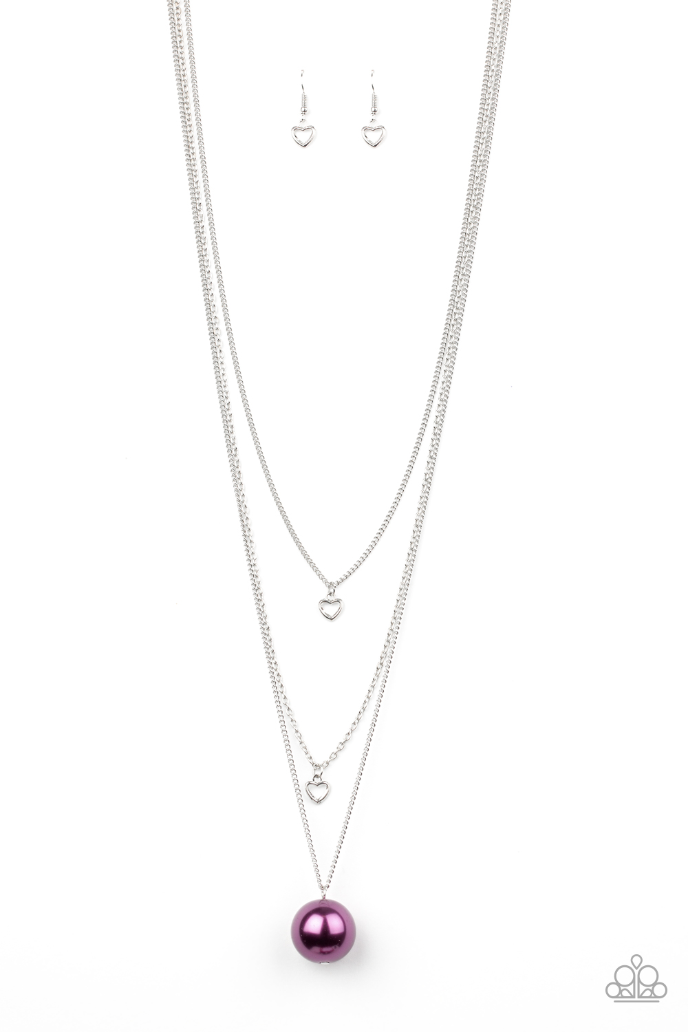 Three shimmery silver chains cascade down the chest. Two dainty silver heart charms swing from the uppermost chains, giving way to a dramatically oversized purple pearl for a romantic finish. Features an adjustable clasp closure.