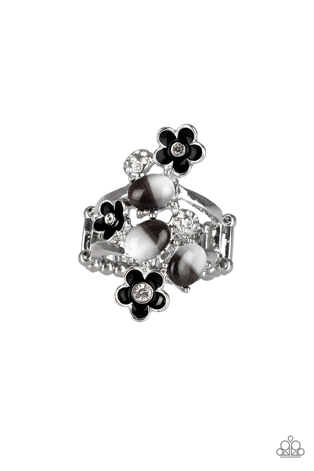 Featuring half and half black and white moonstones, shiny black daisies and glittery white rhinestone flowers dance across the finger for a seasonal look. Features a stretchy band for a flexible fit.