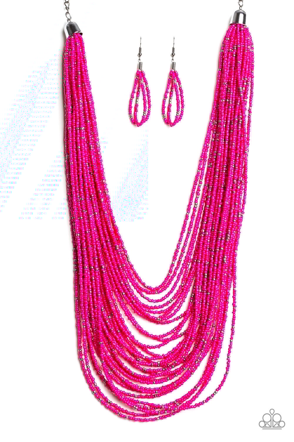 Suspended between two gunmetal fittings, row after row of countless strands of Pink Peacock seed beads layer below the collar. Dainty gunmetal seed beads are sprinkled across the strands for a seasonal finish. Features an adjustable clasp closure.