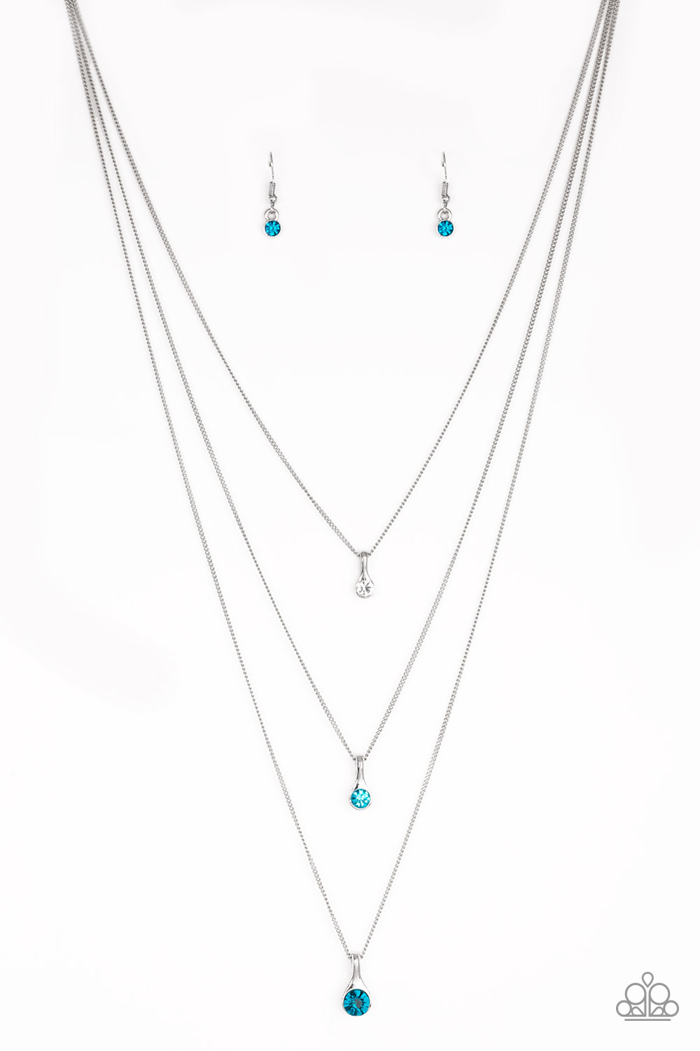 Gradually increasing in size as they drip down the chest, a trio of white, light blue and blue rhinestone pendants trickle from the bottoms of layered silver chains for a delicate ombre effect. Features an adjustable clasp closure.
