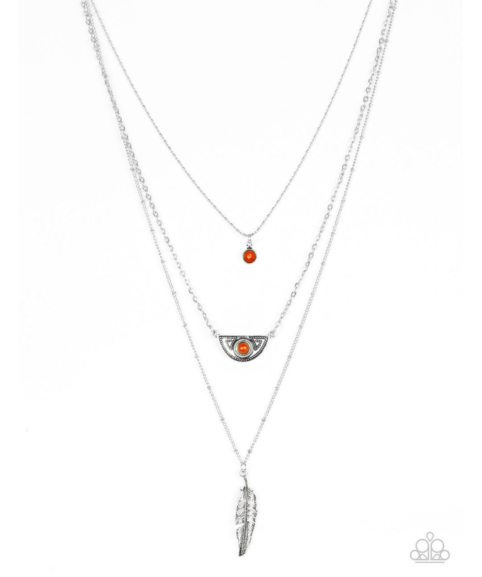 Featuring indigenous inspired pendants, mismatched silver chains layer down the chest for a seasonal look. Featuring earthy orange beaded accents, dainty silver frames give way to a lifelike silver feather pendant for a free-spirited finish. Features an adjustable clasp closure.