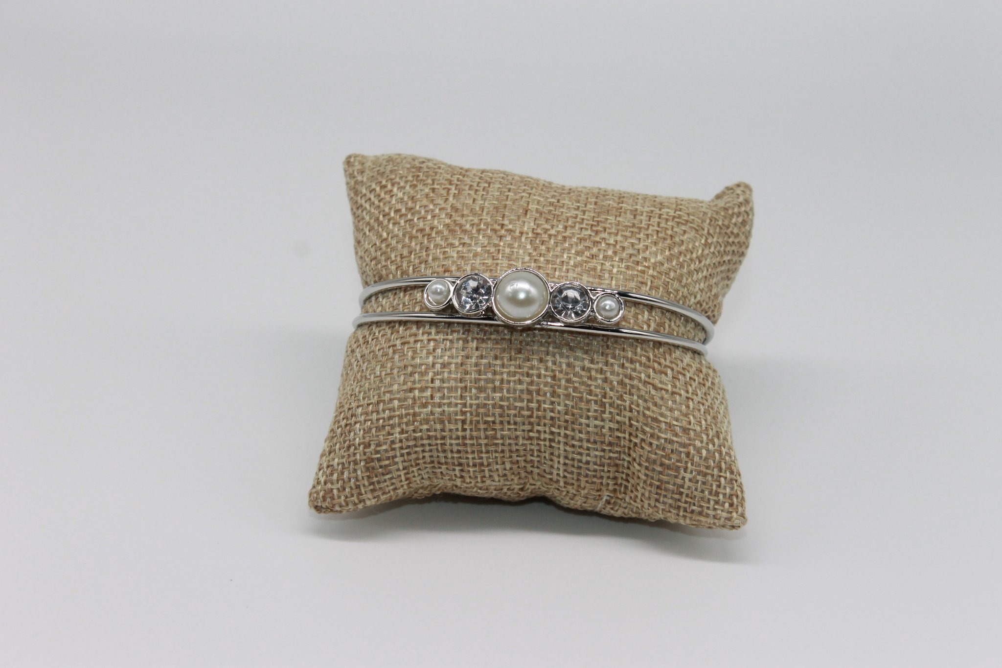 This silver toned cuff is the perfect bracelet for any formal event. It features white pearled beads and white rhinestones that make it a stunning piece.