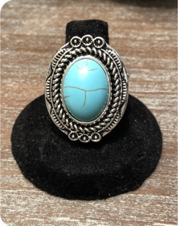 A refreshing Turquoise stone is pressed into an antiqued silver frame radiating with floral detail for a seasonal look. Features a stretchy band for a flexible fit.