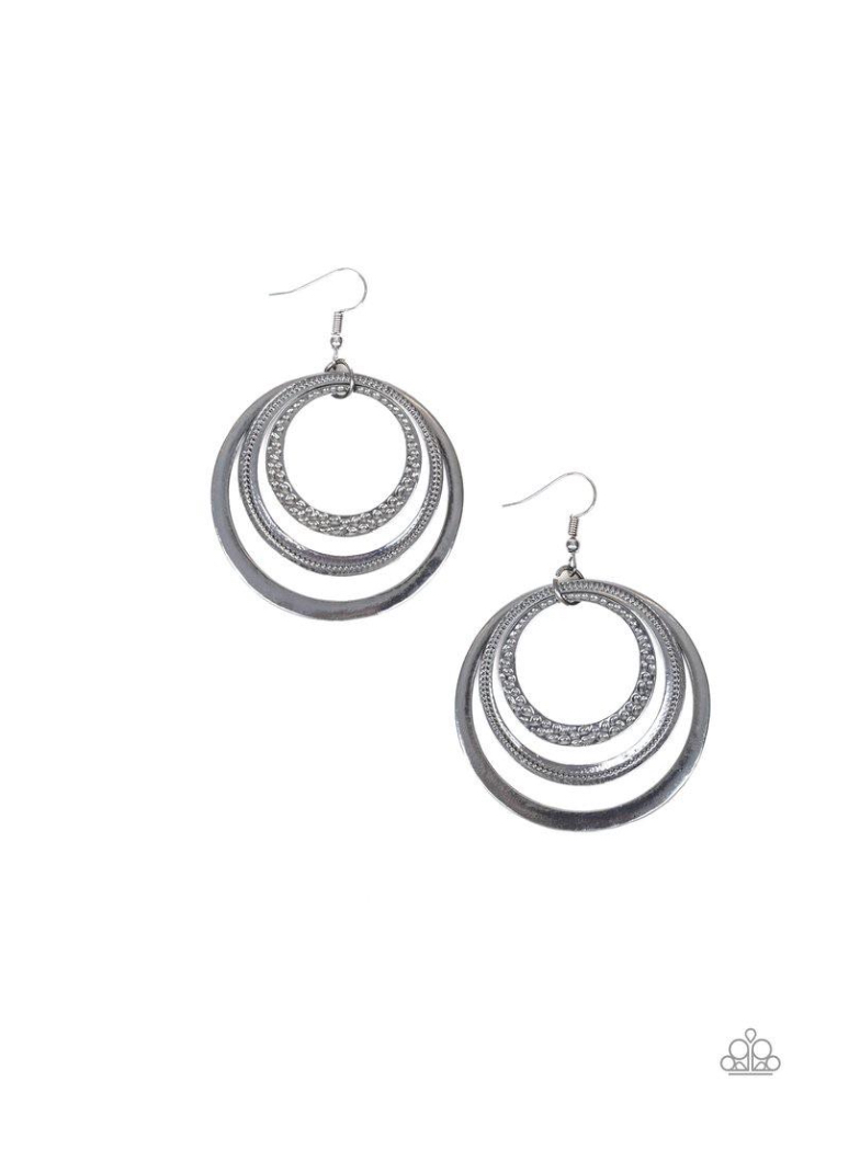 A collision of smooth and textured silver hoops trickle from the ear for a versatile look. Earring attaches to a standard fishhook fitting.