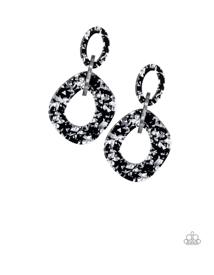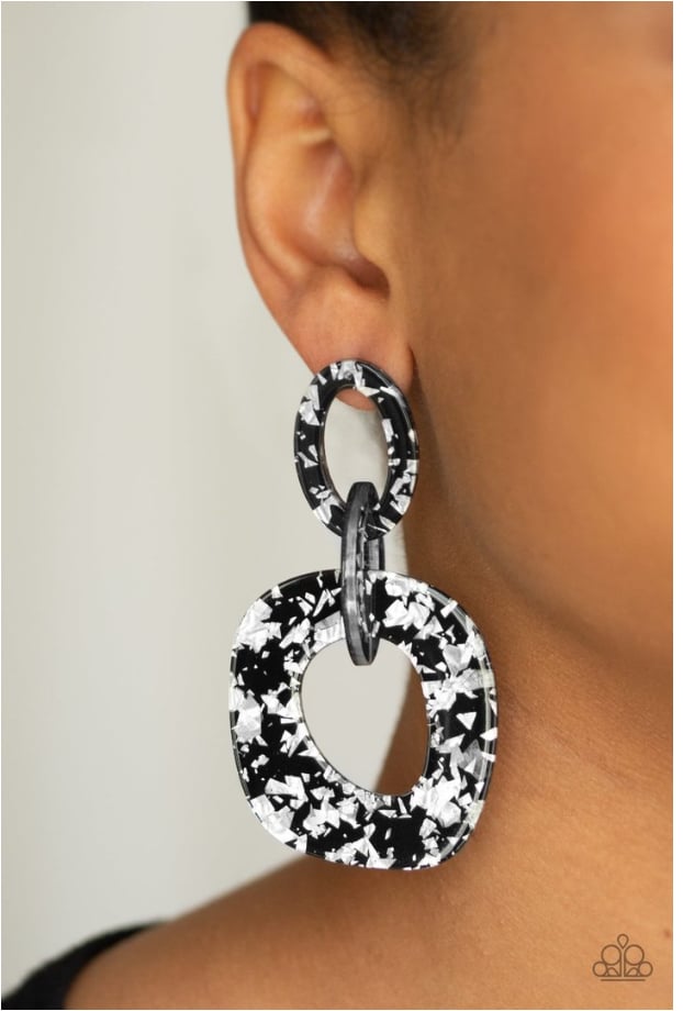 Flecked in metallic shimmer, glittering black acrylic frames link into an abstract frame for a retro-radiant look. Earring attaches to a standard post fitting.