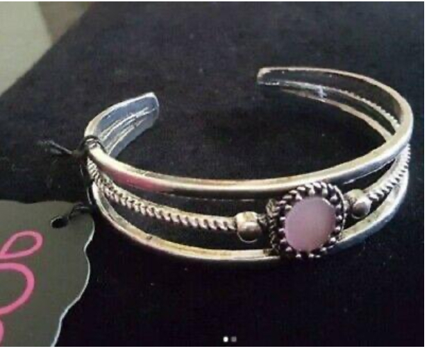 Smooth silver bars flank a textured silver band, coalescing into a layered cuff. A glowing pinj cat's eye stone is pressed into the center of the cuff for a whimsical finish.
