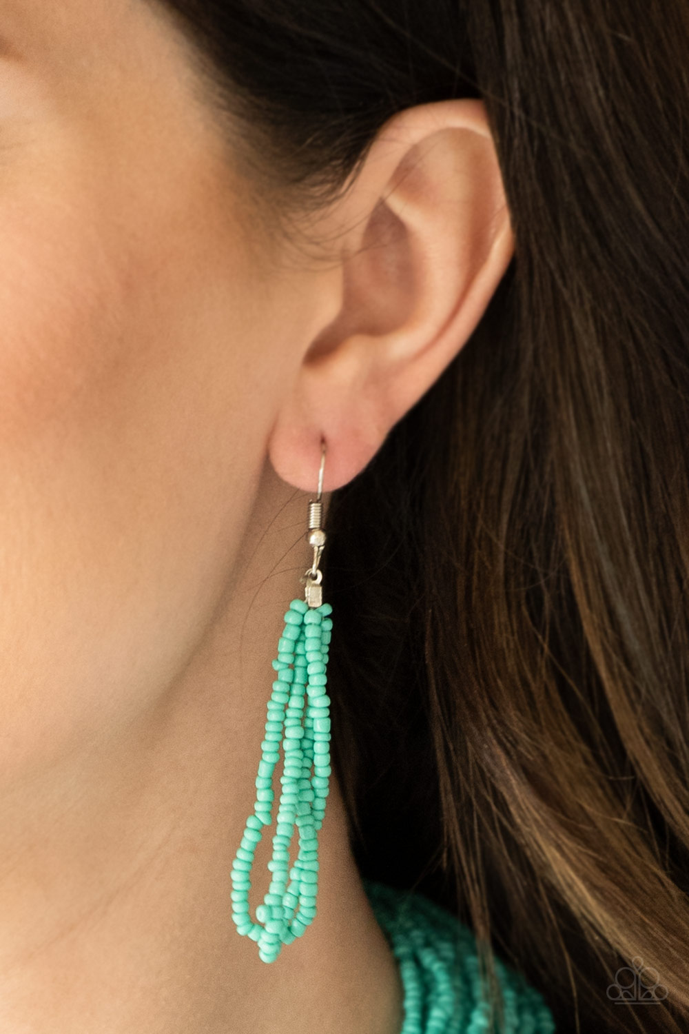 Infused with two bold silver fittings, countless strands of turquoise seed beads drape below the collar for a seasonal look. Features an adjustable clasp closure.