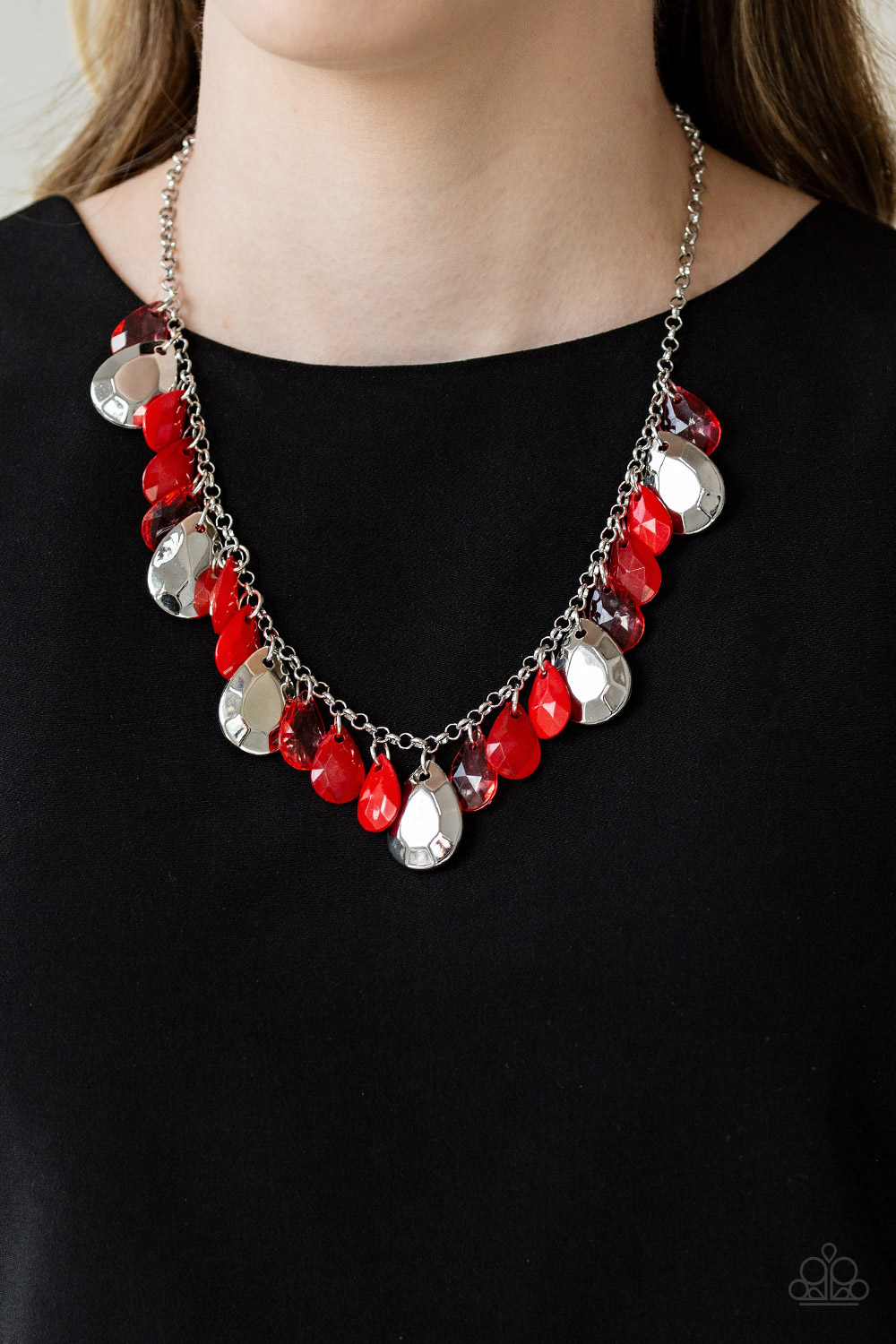 Glassy and polished red teardrops drip from the bottom of a shimmery silver chain. Faceted silver teardrops trickle between the colorful beading, adding a flashy finish to the flirtatious fringe. Features an adjustable clasp closure.