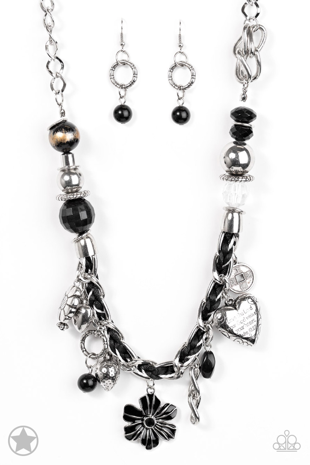 Black and ivory cording is braided through a chunky silver chain. A unique variety of charms decorate the piece including a delicate flower and a heart. Heart is inscribed with the phrase "With All My Heart"on one side and a short bible verse on the other that reads, "Love the Lord thy God with all your heart. Luke 10:27." Features an adjustable clasp closure.