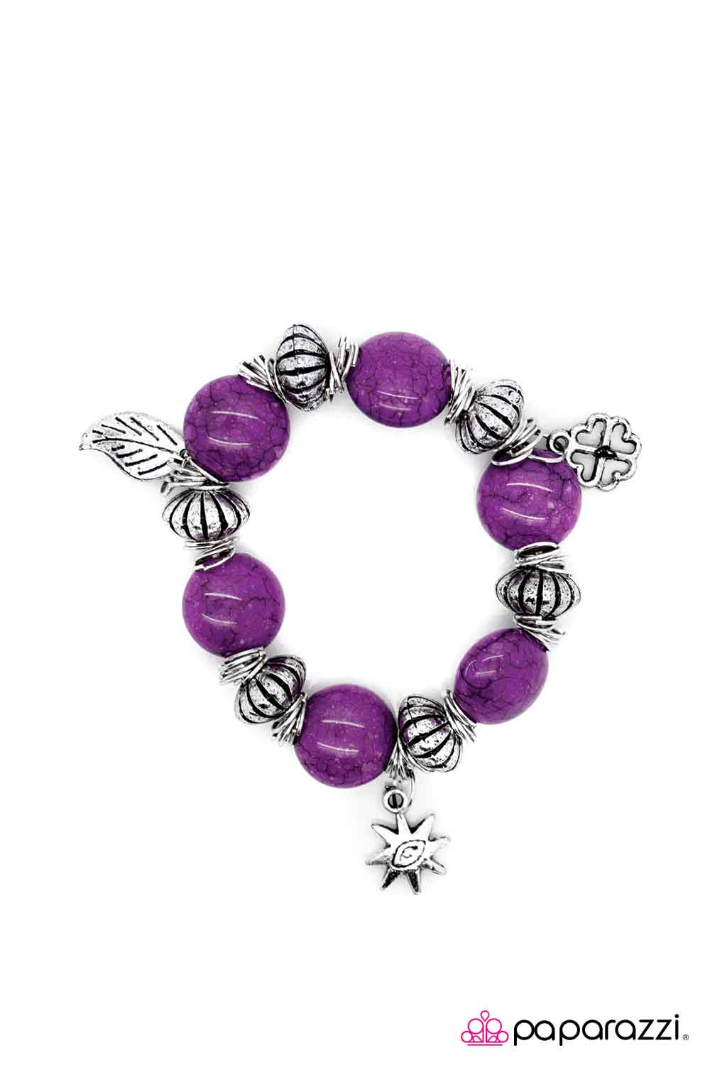Smooth purple beads in a faux-rock finish are threaded along a stretchy band with eclectic silver accents and charms. Charms include a leaf, a sun, and a clover.