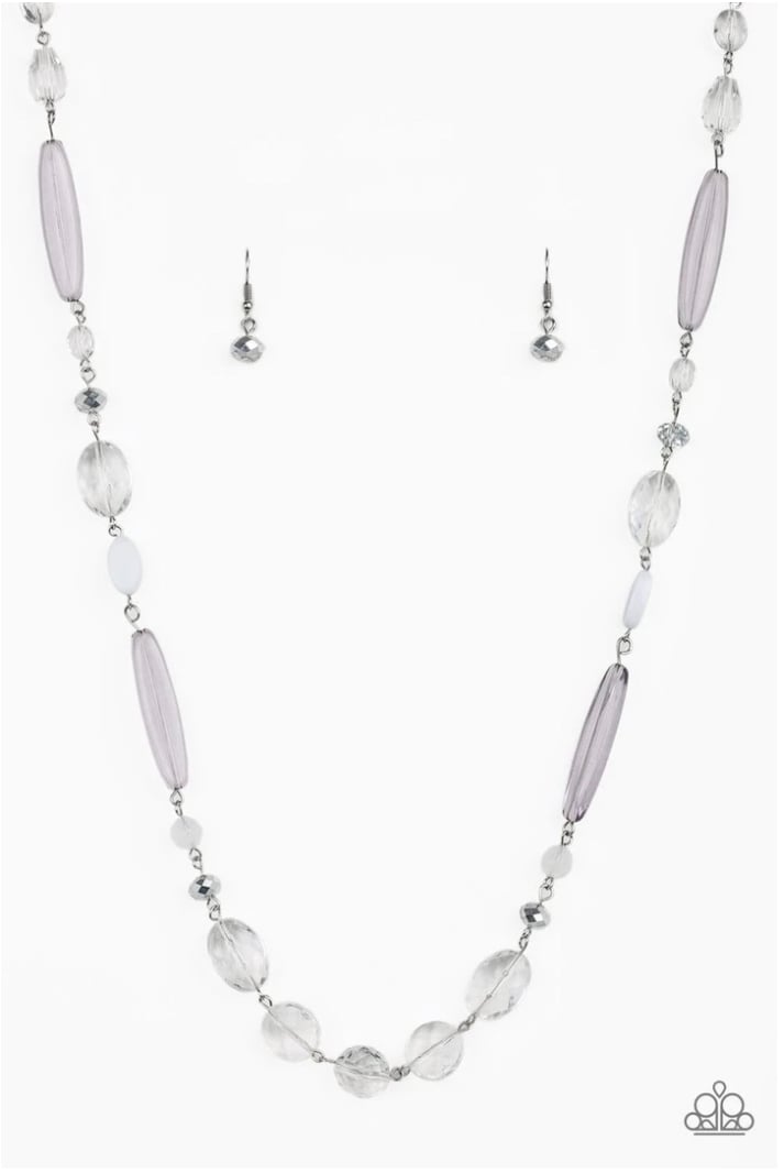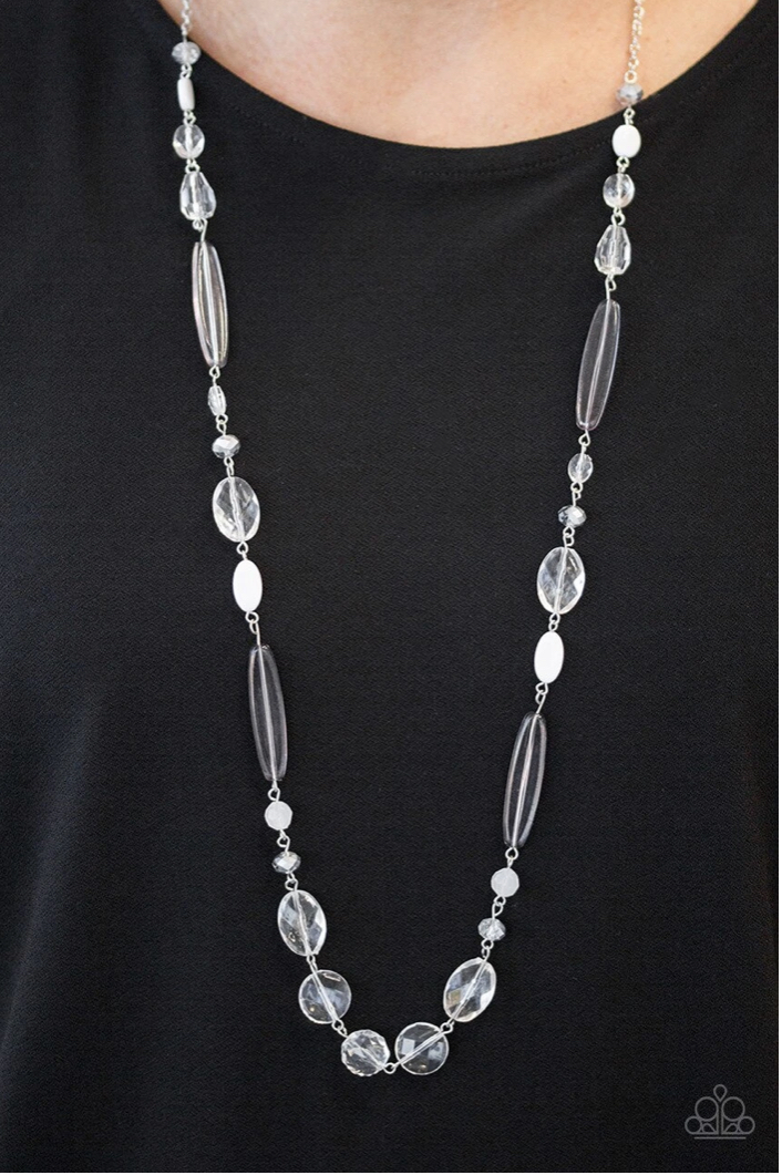 Varying in shape and shimmer, faceted white and metallic crystal-like beads trickle down the chest for a whimsical look. Features an adjustable clasp closure.