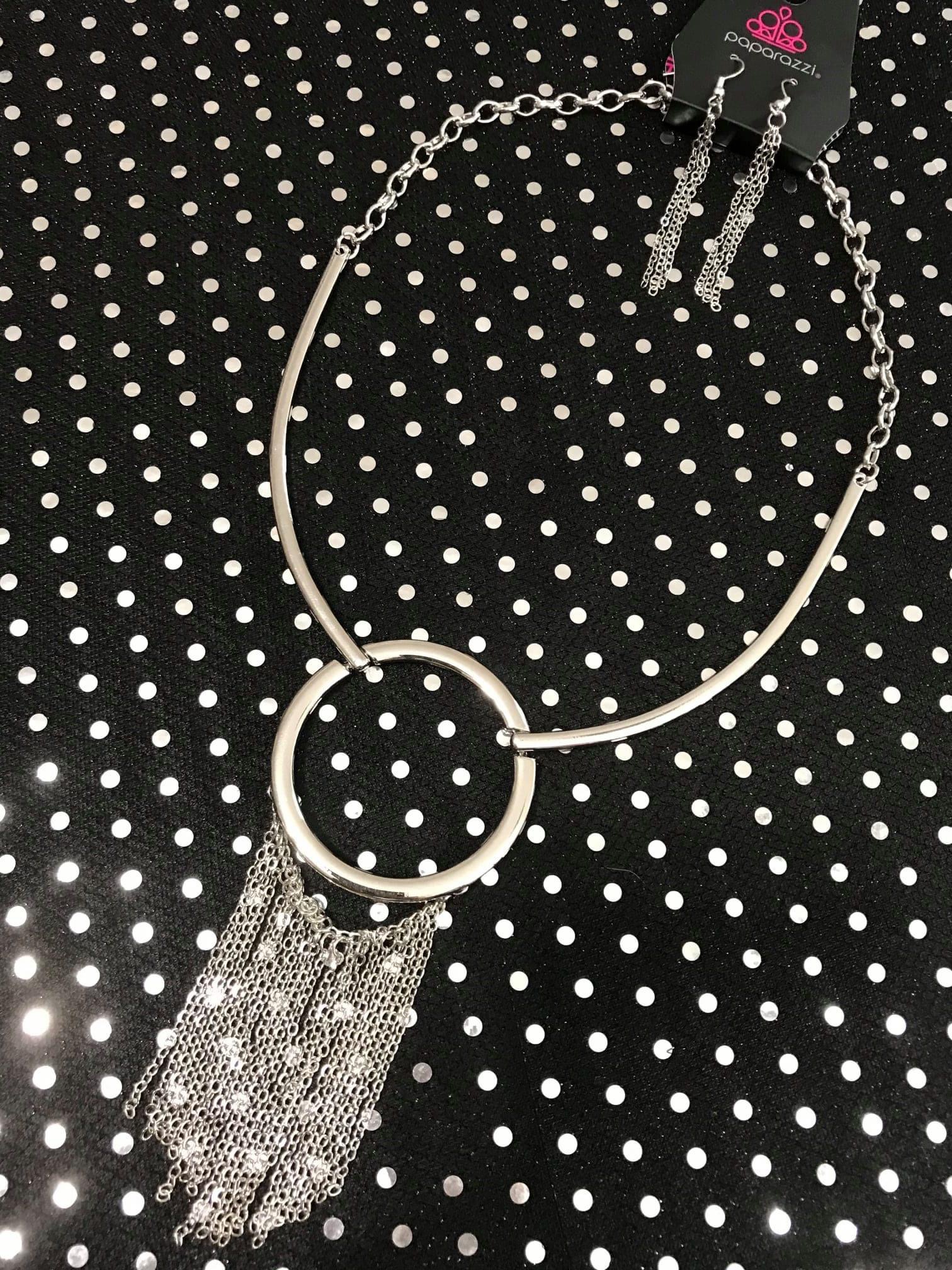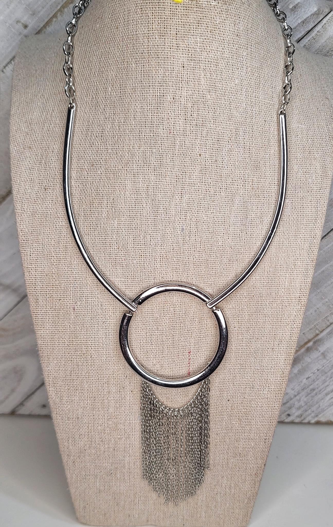 Attached to two bowing shiny silver bars, a shiny silver hoop gives way to a matching chain fringe, creating a statement making look below the collar. Features an adjustable clasp closure. Sold as one individual necklace with matching earrings.