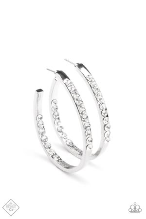The front edge of an elongated silver hoop is encrusted in glassy white rhinestones, creating a striking shimmer. Rhinestones also climb the inside edge of the hoop, creating the illusion of all-encompassing shimmer. Earring attaches to a standard post fitting. Hoop measures approximately 1 3/4” in diameter.