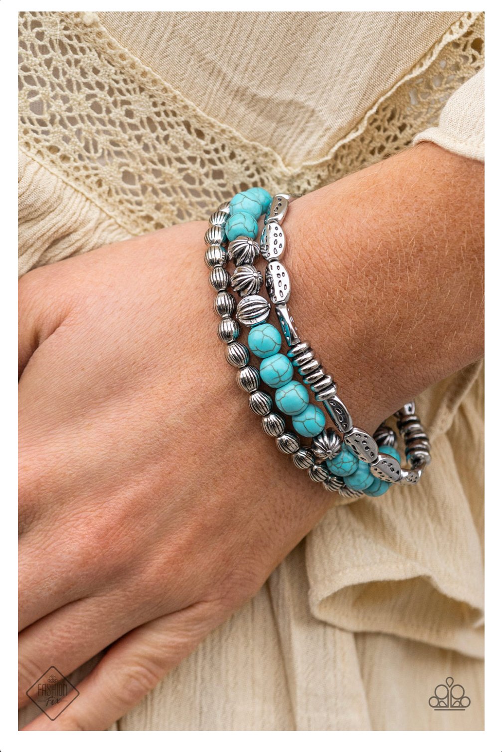 An earthy collision of turquoise stones , ornate silver beads, and hammered silver accents are threaded along stretchy bands, creating colorful layers that stack up the wrist.