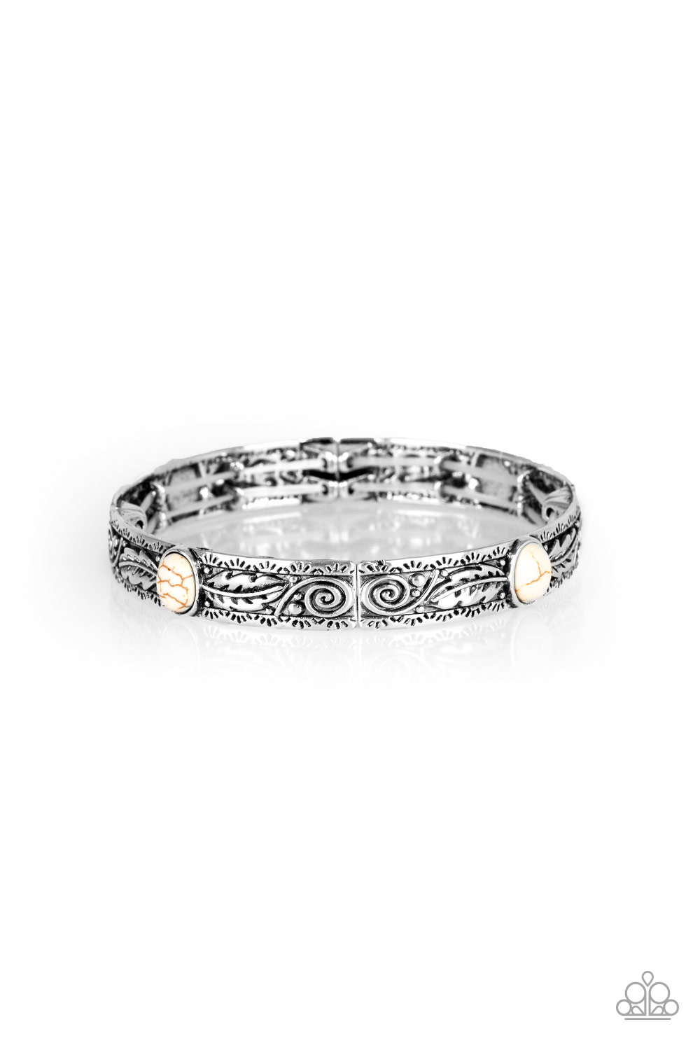 Embossed in swirling silver and feather like detail, antiqued silver frames are threaded along stretchy bands around the wrist. Refreshing white stones adorn the centers of the Southwestern frames for a seasonal finish.