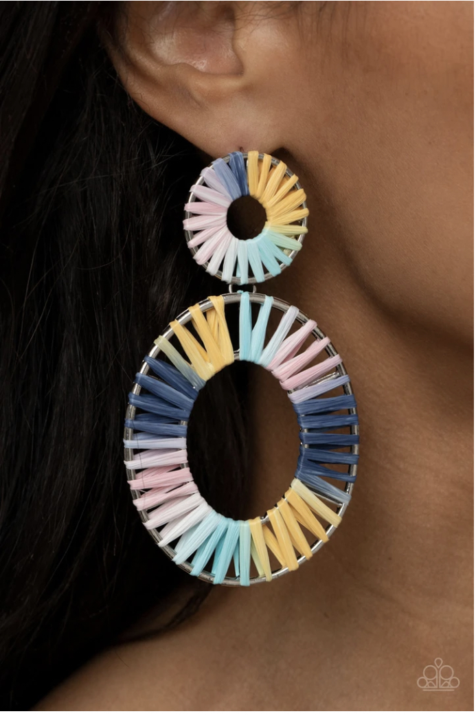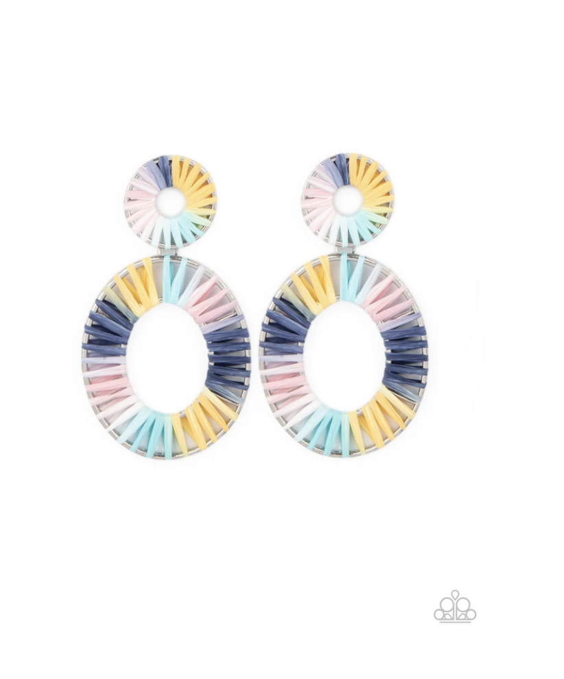 Tie dyed wicker-like accents wrap around an oversized silver oval and dainty circular frame, linking into a colorful lure. Earring attaches to a standard post fitting.